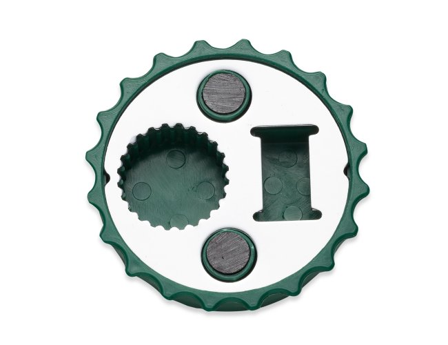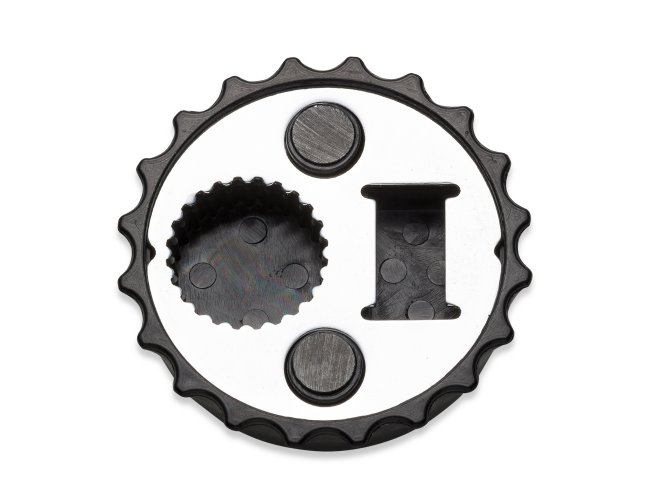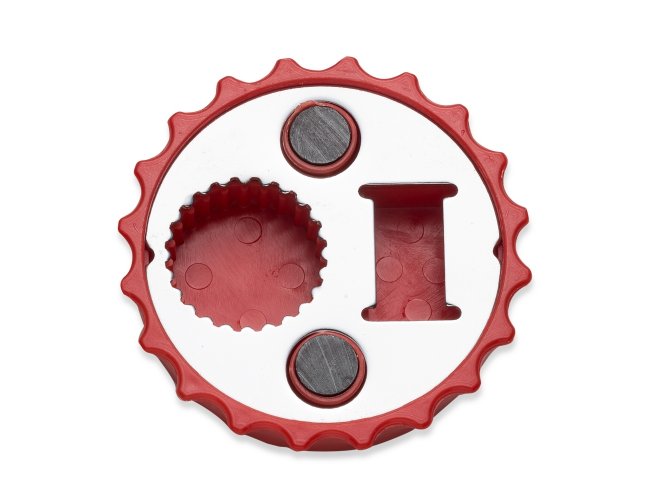 Abridor formato tampa de garrafa com imã para geladeira, contém dois tipos de abridores de garrafa.