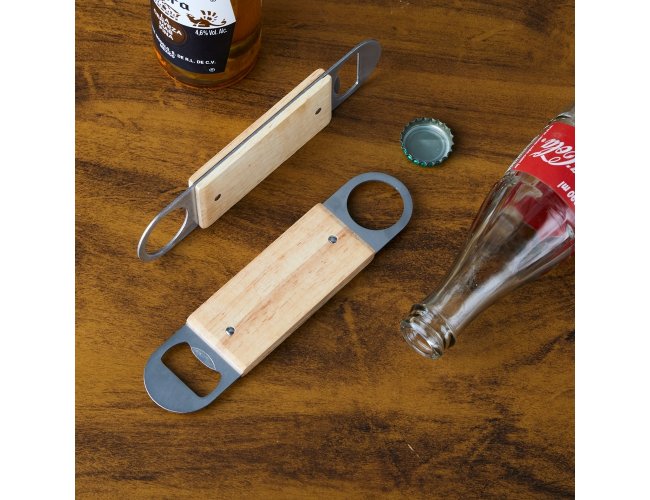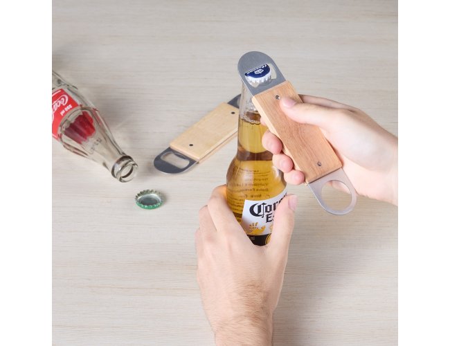 Abridor de garrafa com cabo de madeira e argolas em aço inox resistente.
