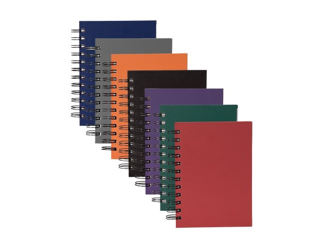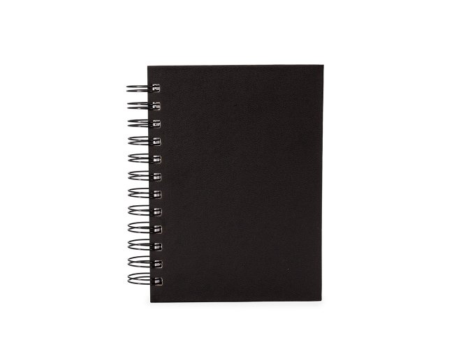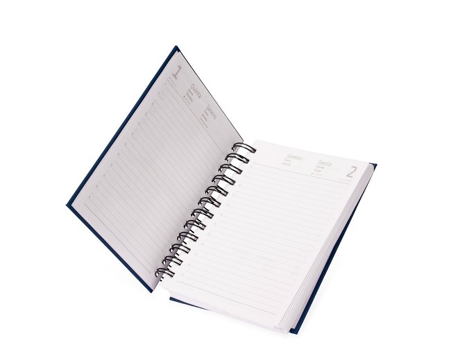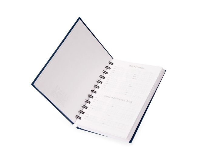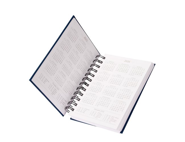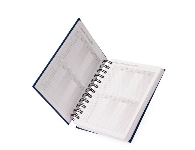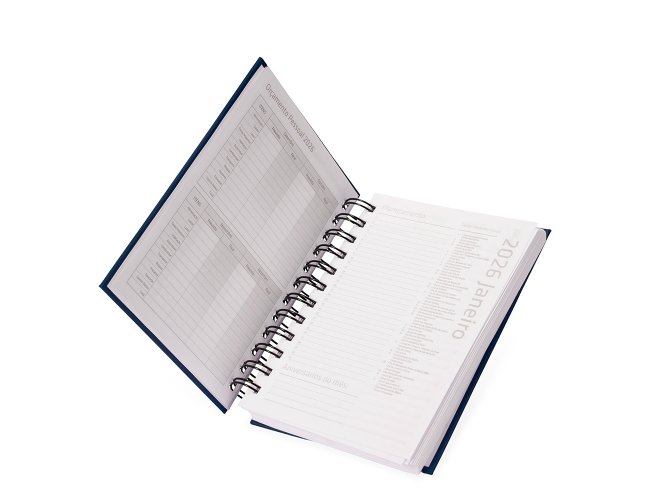 Agenda 2026 com capa em cromato e encadernação em Wire-O metálico. Conta com páginas dedicadas para dados pessoais, calendários de 2025 a 2027, orçamento pessoal, planejamento mensal, espaço para anotações diárias e lista de contatos e aniversários.
