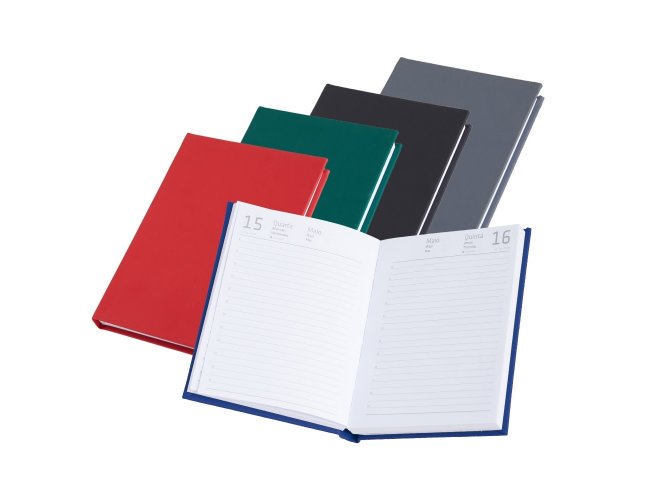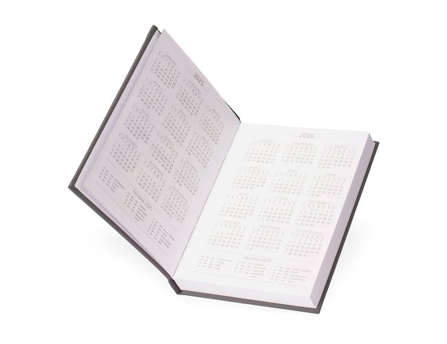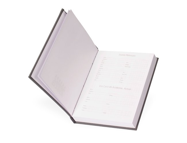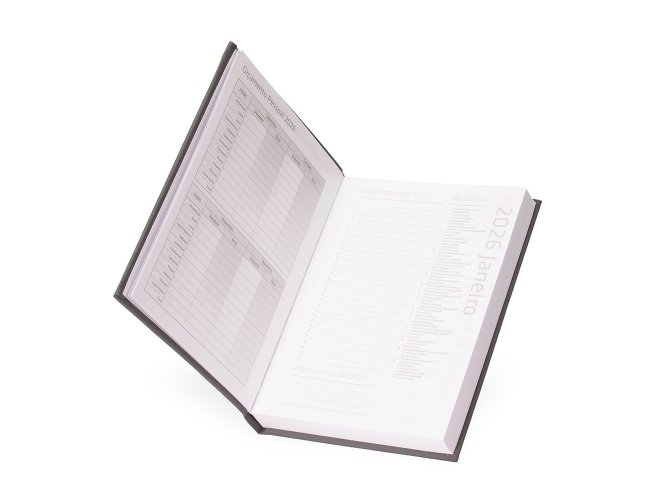 Agenda 2026 com capa emborrachada. Conta com páginas dedicadas para dados pessoais, calendários de 2025 a 2027, orçamento pessoal, planejamento mensal, espaço para anotações diárias e lista de contatos e aniversários.