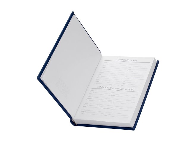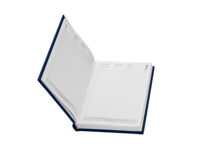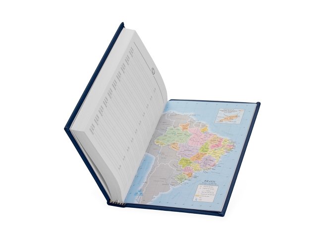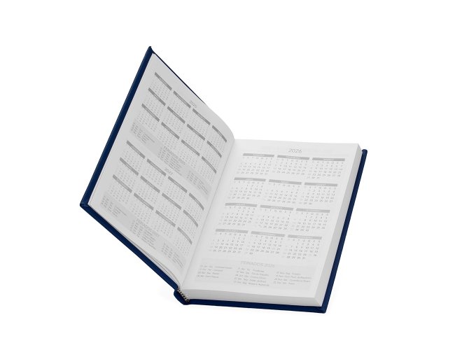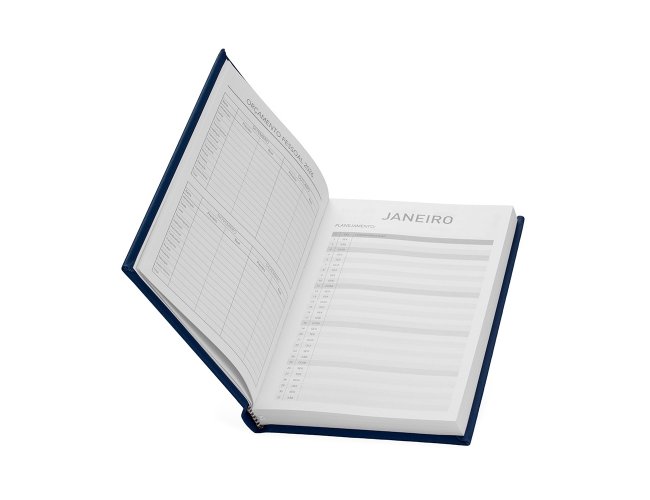 Agenda 2026 com capa dura de revestimento emborrachado. Contém páginas dedicadas para dados pessoais, calendários de 2025 até 2027, orçamentos mensais, anotações, planejamentos mensais, lista de contatos e mapas.