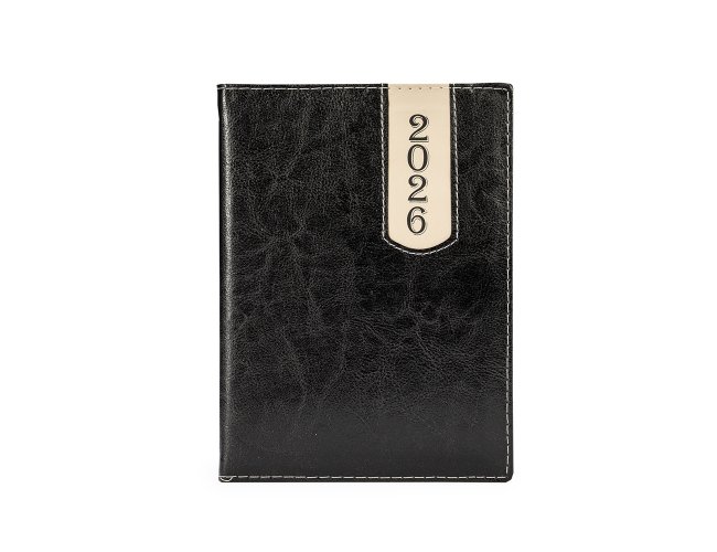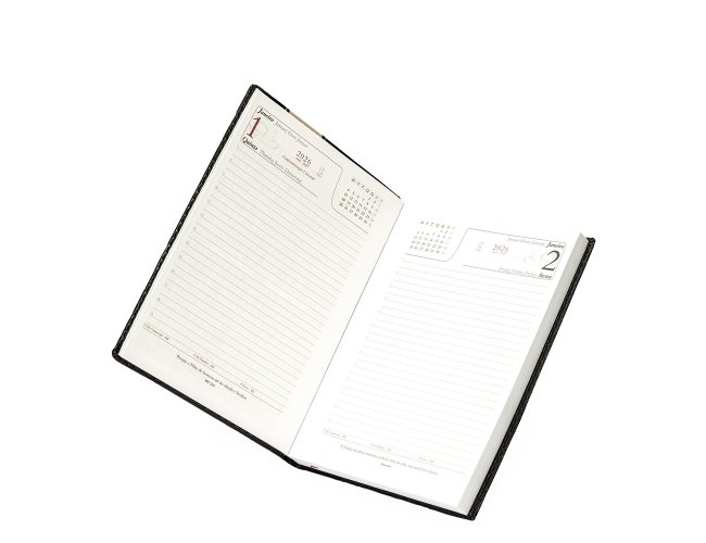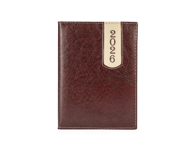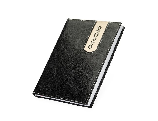 Agenda diária com capa em couro sintético, detalhes de costura e o ano "2026" presente no canto superior direito. Contém marca-páginas em fita de cetim, páginas dedicadas a dados pessoais, calendários de 2025 a 2027, contatos, planejamento diário e mapas.