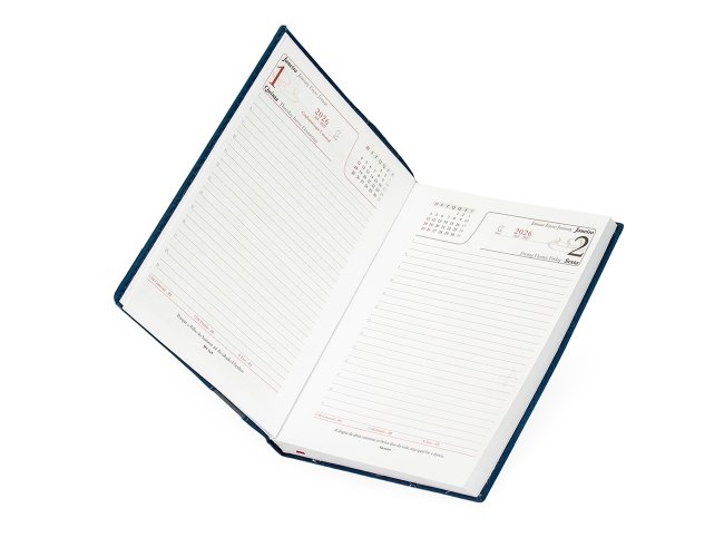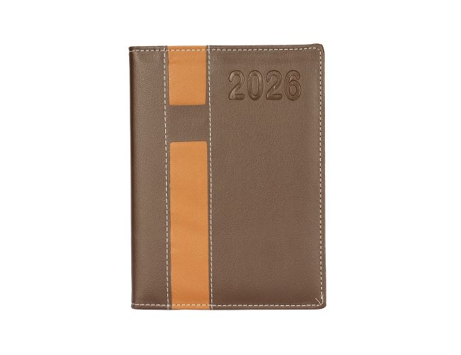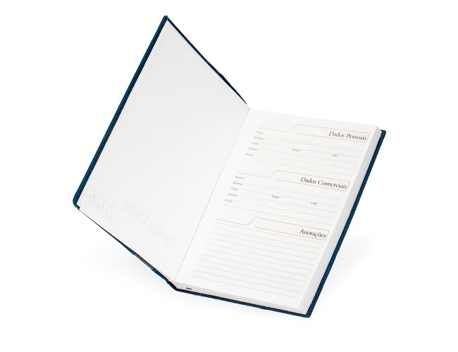 "Agenda diária 2026 com capa em couro sintético, suporte para caneta e marca-páginas em fita de cetim. Possui páginas dedicadas a dados pessoais, calendários de 2025 a 2027, lista de contatos, planejamento diário e mapas.