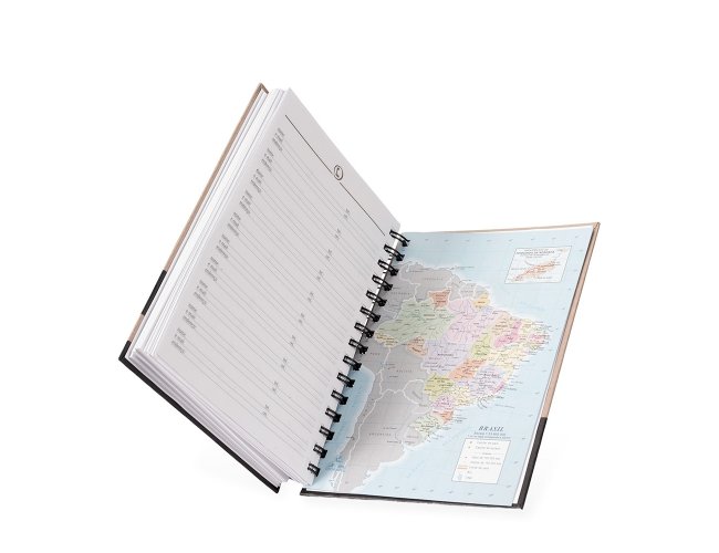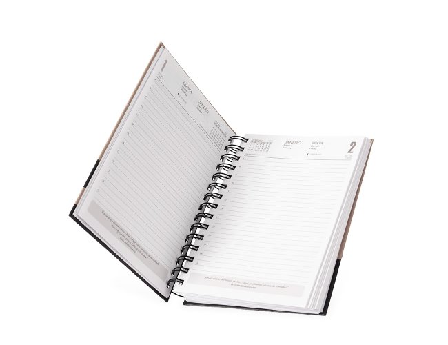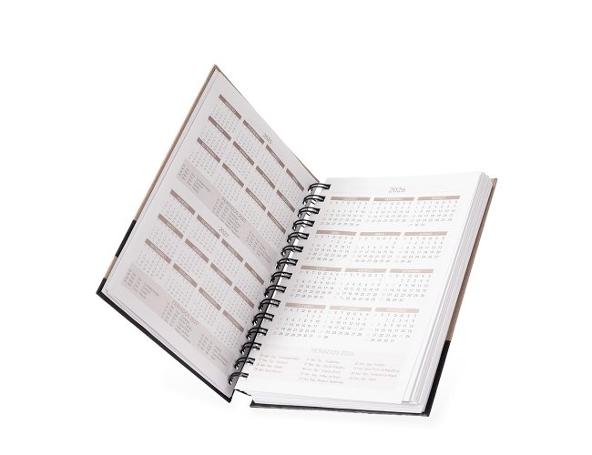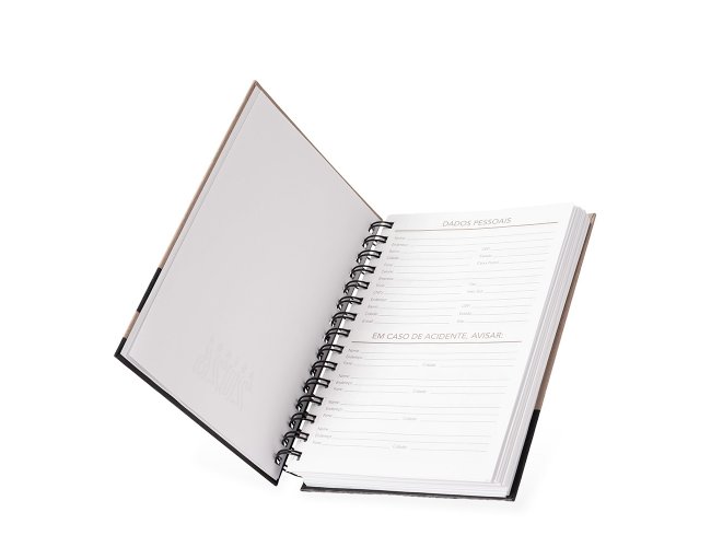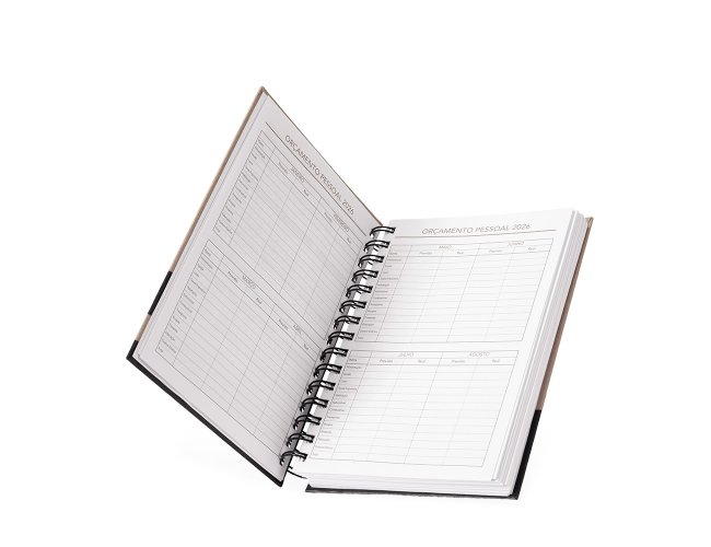 Agenda diária modelo 2026 com capa dura em kraft e encadernação em Wire-O. Contém páginas dedicadas a dados pessoais, calendários de 2025 a 2027, orçamento pessoal, planejamento mensal, espaço para anotações, lista de contatos e mapas.