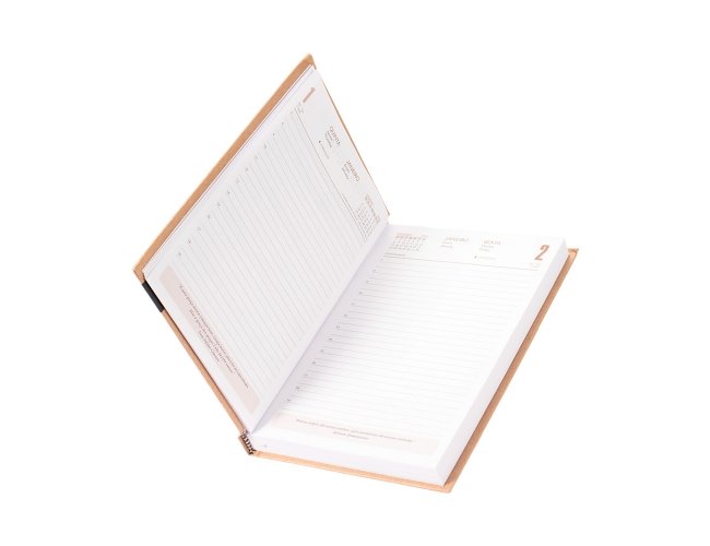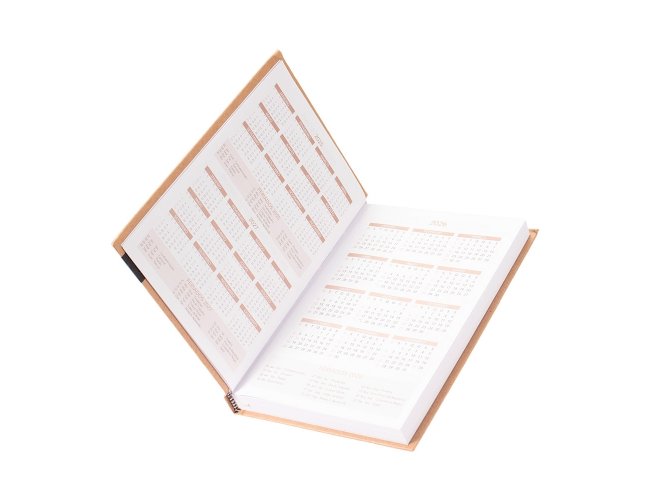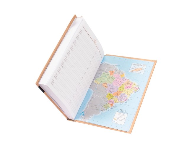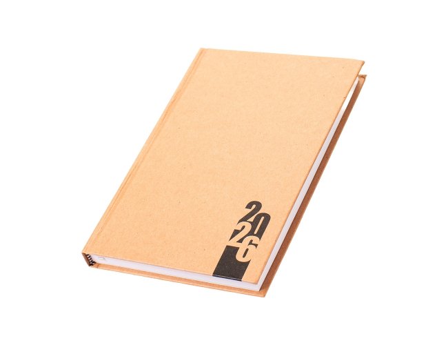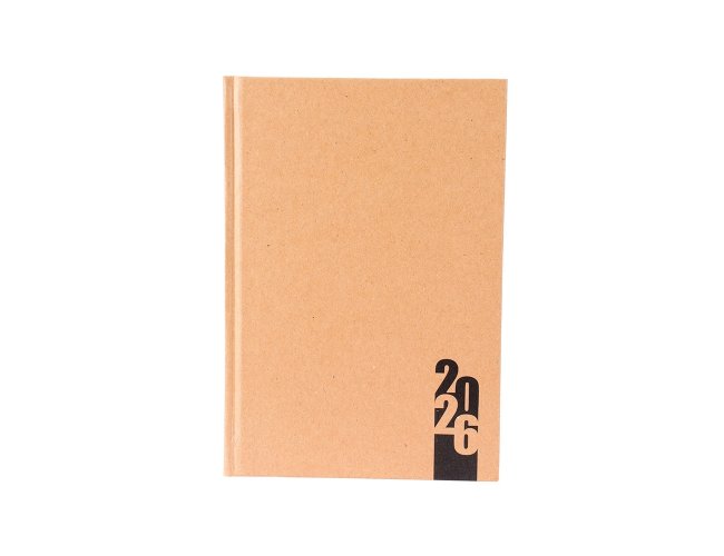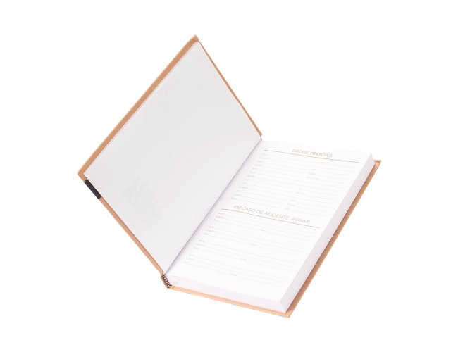 Agenda diária modelo 2026 de capa dura em kraft e marcador de páginas em fita de cetim. Apresenta páginas dedicadas à dados pessoais, calendários de 2025 até 2027, orçamentos pessoais, anotações, planejamento mensal, endereços de contato e mapas.