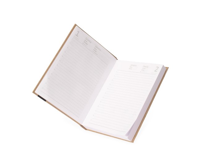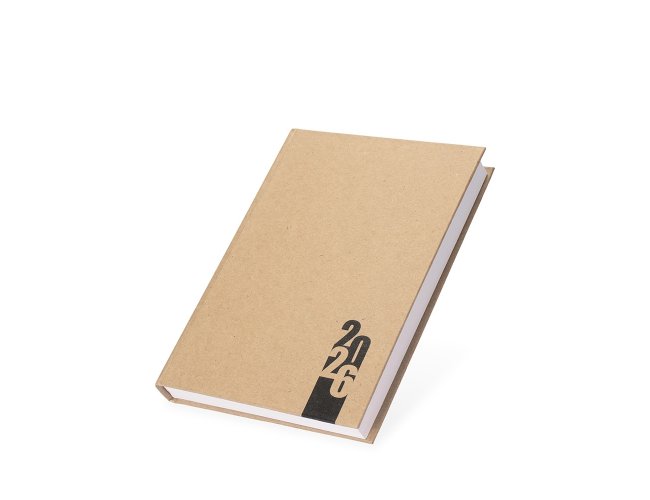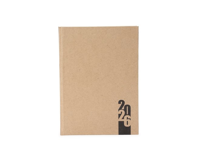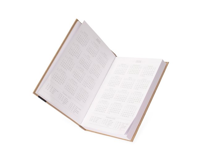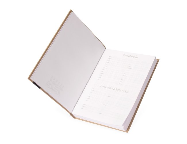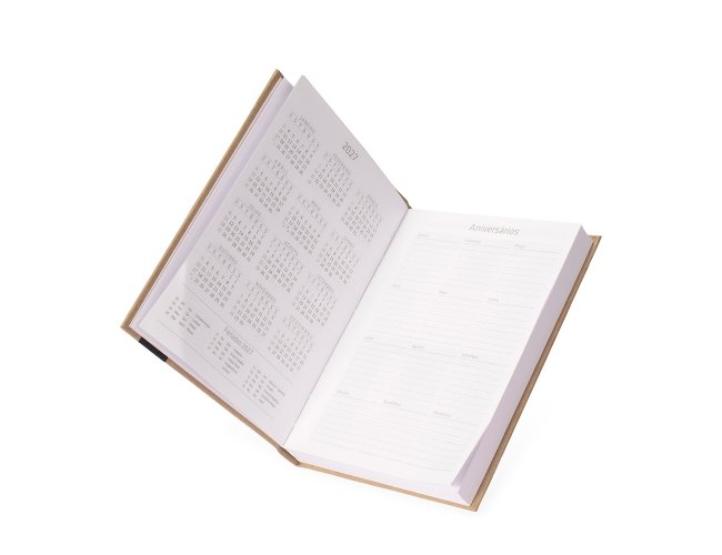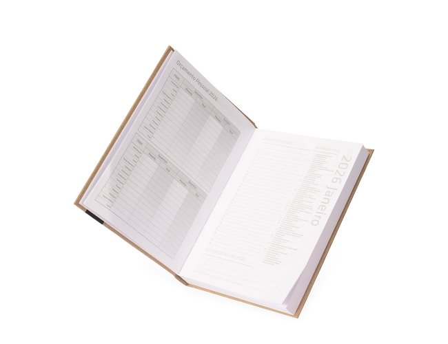 Agenda diária modelo 2026 de capa em kraft. Conta com páginas dedicadas para dados pessoais, calendários de 2025 a 2027, orçamento pessoal, planejamento mensal, espaço para anotações diárias e lista de contatos e aniversários.