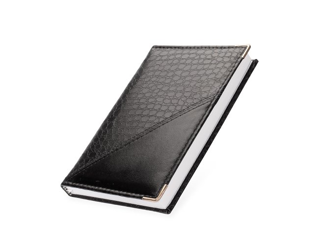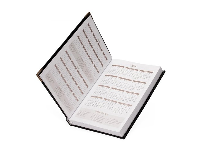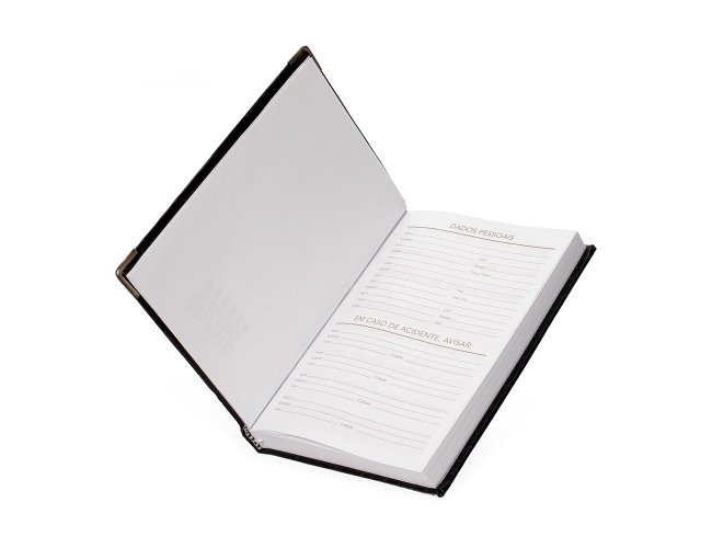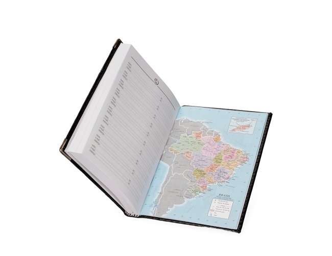 Agenda diária com capa feita em couro sintético e marca-página em fita de cetim. Contém páginas dedicadas a dados pessoais, calendários de 2025 até 2027, orçamento pessoal, anotações, planejamentos mensais, lista de contatos e mapas.