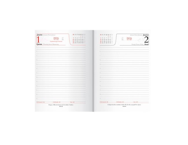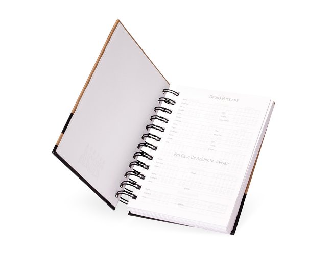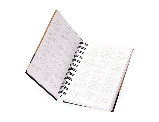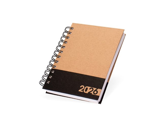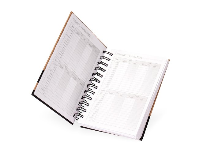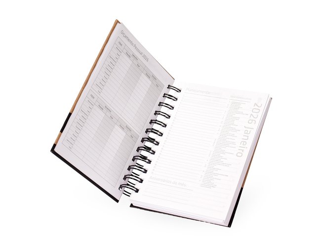 Agenda diária 2026 com capa dura em kraft, folhas brancas e encadernação Wire-O. Possui páginas dedicadas a dados pessoais, calendários de 2025 até 2027, orçamento pessoal, planejamento mensal, anotações diárias lista de contatos e aniversários do mês.