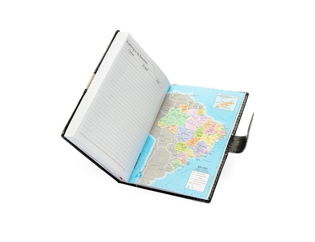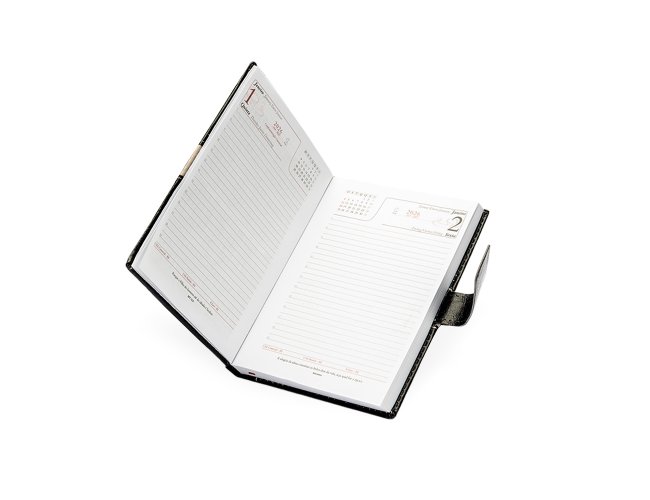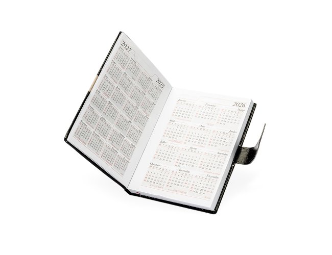 Agenda diária 2026 com capa em couro sintético, marca-páginas em fita de cetim e fecho com suporte para caneta. Contém páginas dedicadas para dados pessoais, calendários de 2025 a 2027, lista de contatos, planejamento e mapas.OBS.: IMAGEM MERAMENTE ILUSTRATIVA, NÃO ACOMPANHA CANETA!