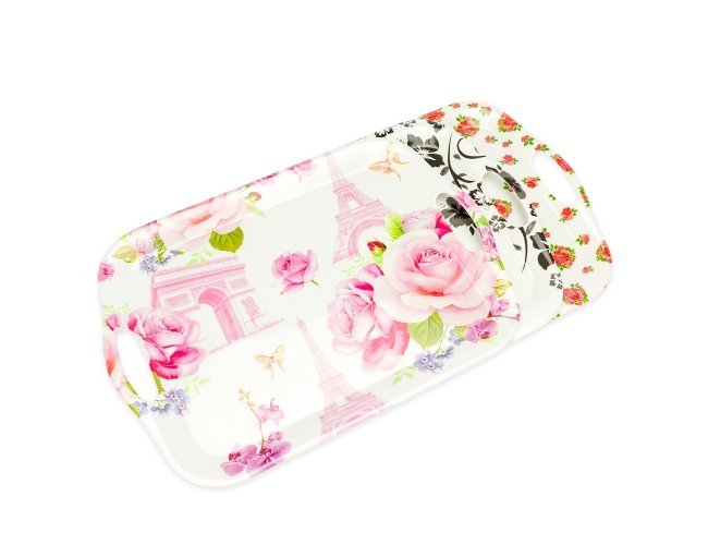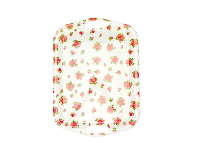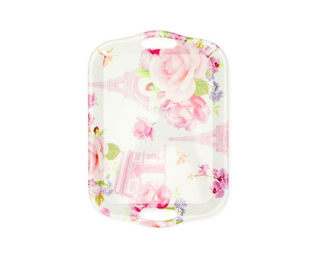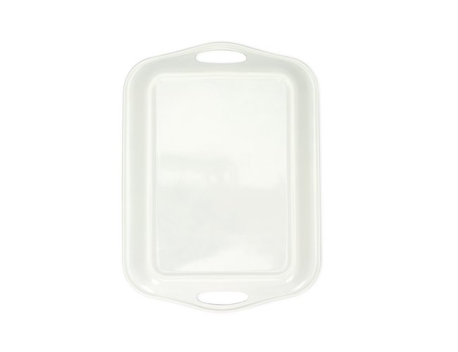 Bandeja retangular em melamina, material leve, resistente e fácil de limpar. Possui alças laterais que facilitam o manuseio.