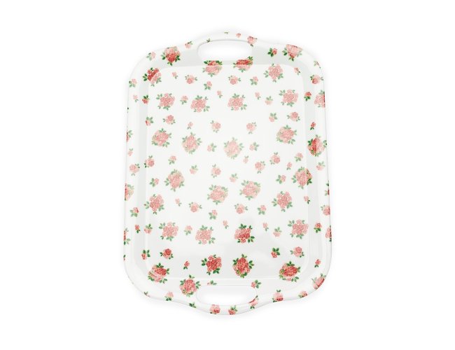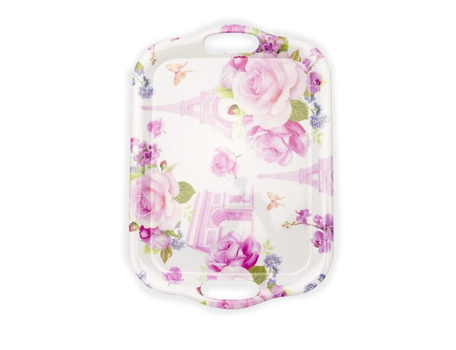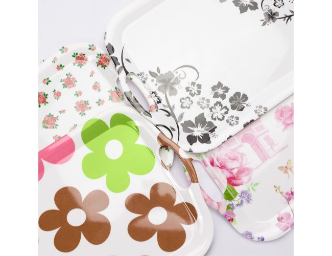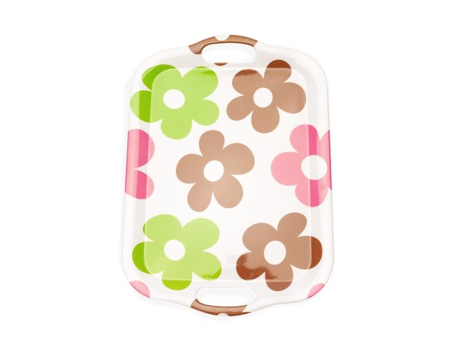 Bandeja retangular em melamina, material leve, resistente a impactos e fácil de limpar. Contém duas alças laterais para transporte.