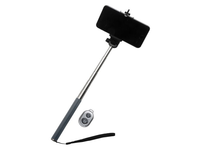 Bastão de selfie alumínio com detalhe emborrachado colorido. Possui suporte plástico, controle plástico, funciona com uma bateria lithium CR2032(não inclusa) . Suporte ajusta até 8,4cm de largura para encaixar celular, bastão estende até 88,2 cm de comprimento. Válvula lateral para ajuste de posicionamento e válvula central para apertar o suporte.