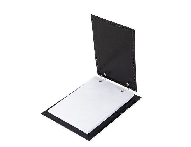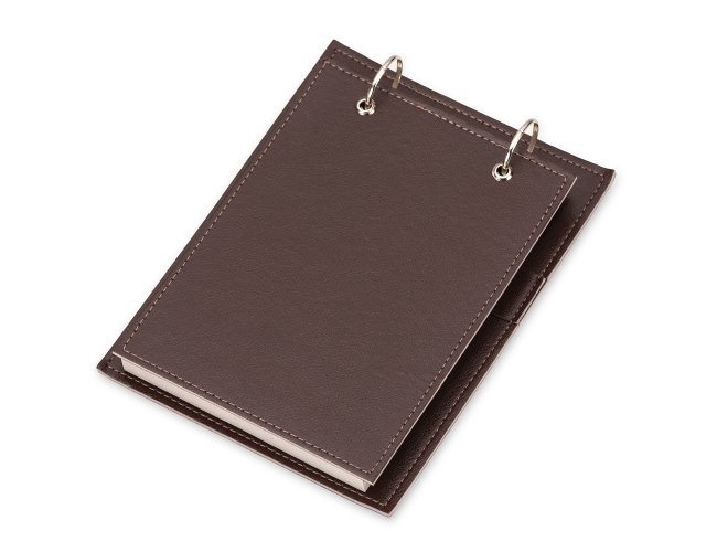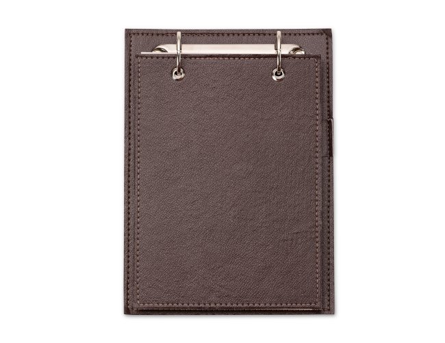 Bloco de anotações de mesa com trilho de ferro, capa em couro sintético. Possui suporte na lateral interna para colocar caneta (não acompanha) e aproximadamente 96 folhas com área destacável.