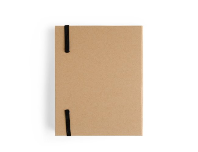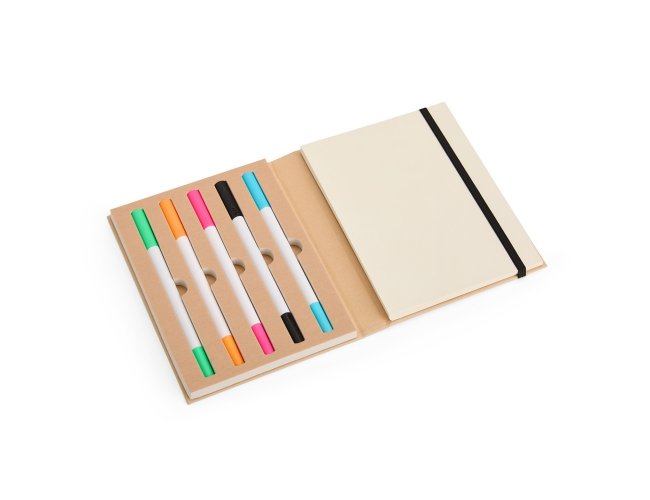 Bloco de anotações com capa dura em kraft e fechamento por elástico. Possui aproximadamente 80 folhas de tonalidade marfim sem pautas e cinco canetas coloridas de ponta dupla: uma fina e outra tipo pincel.