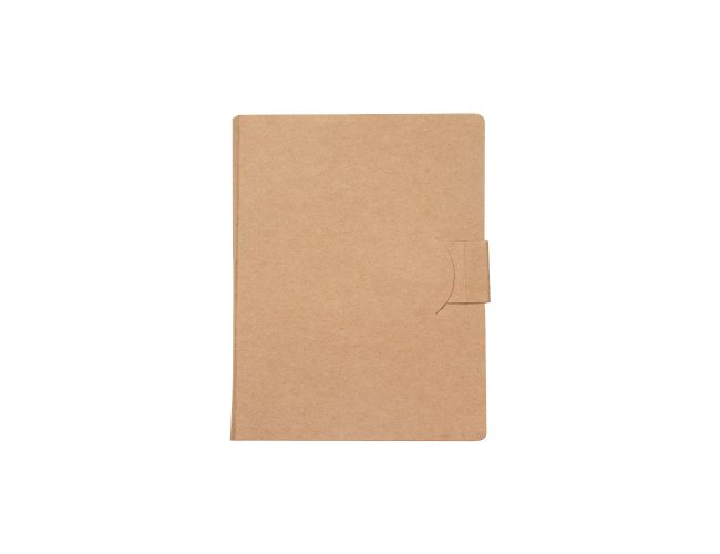 Bloco de anotações ecológico com autoadesivos, feito em kraft. Contém cinco autoadesivos com aproximadamente 25 folhas e dois blocos com aproximadamente 25 folhas amarelas.