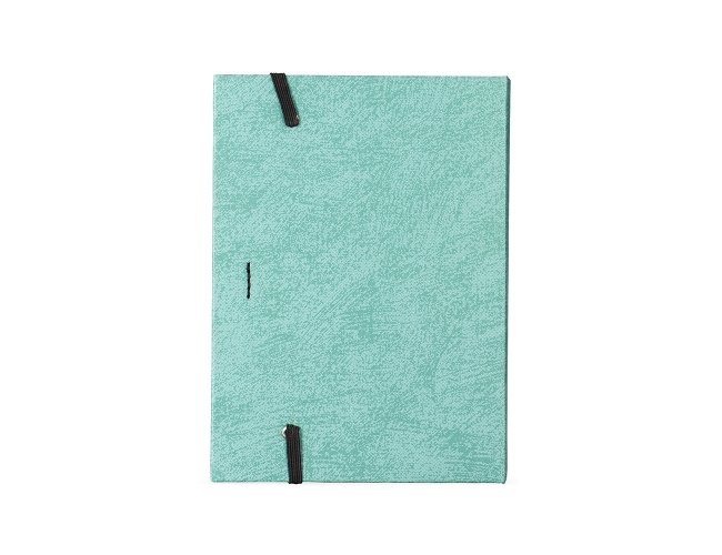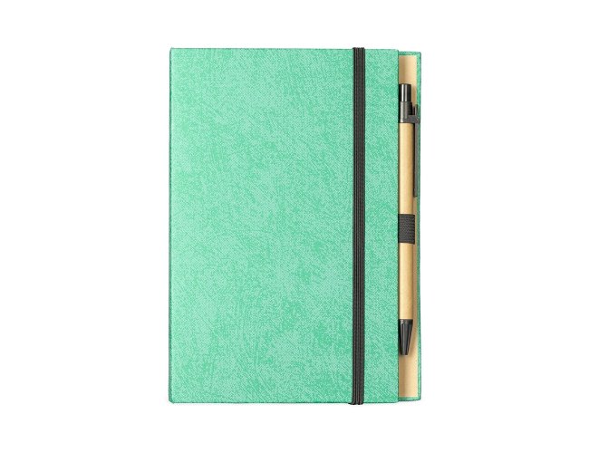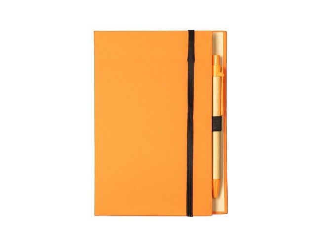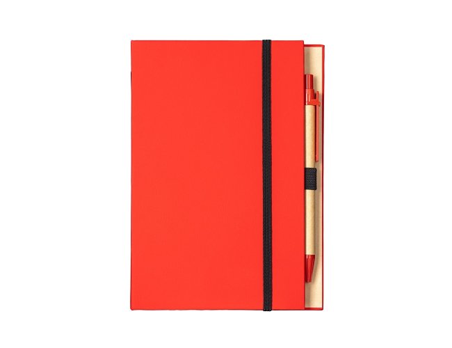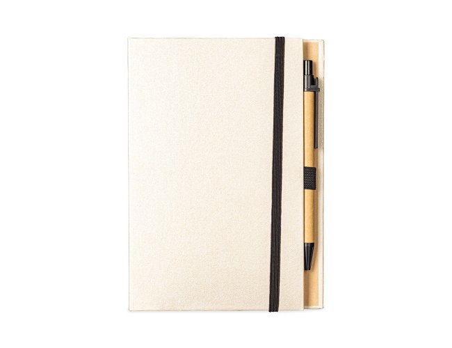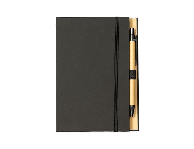 Bloco de anotações com capa dura revestida em papel especial e fita elástica para fechamento. Possui cerca de 80 folhas pautadas, além de um bloco com aproximadamente 20 folhas autoadesivas amarelas e por volta de 100 marcadores de página autoadesivos, divididos em cinco cores diferentes. Acompanha uma caneta esferográfica com carga azul de 1.0mm e acionamento por clique, corpo em papelão e demais componentes em plástico.