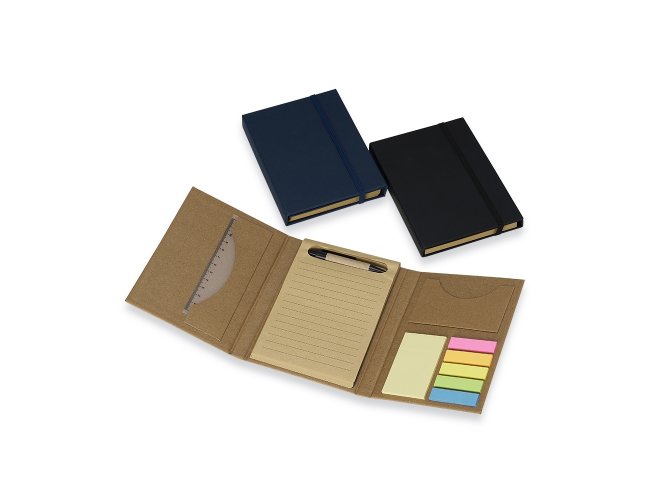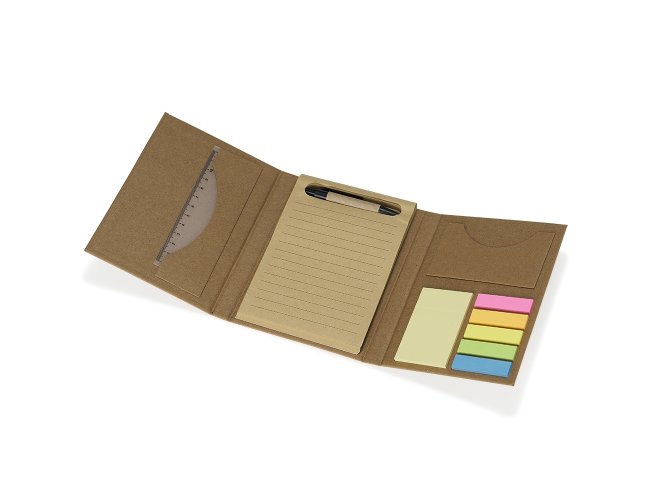 Bloco de anotações em papel kraft pautado em kraft, possui notas autoadesivas, compartimento para guardar anotações, uma régua em material plástico de 12 cm e caneta. Obs.: O bloco possui aproximadamente 70 folhas.