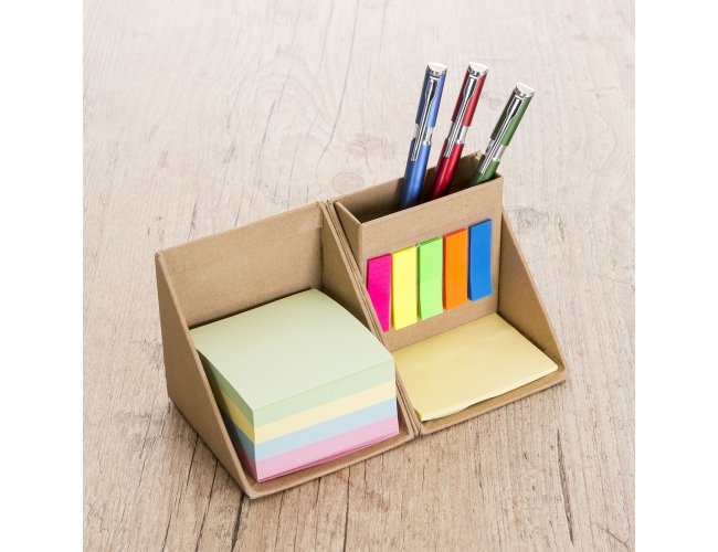 Bloco de anotações formato cubo com autoadesivos, abre e fecha em diagonal. Possui 5 blocos autoadesivos com aproximadamente 26 folhas cada, bloco amarelo com aproximadamente 25 folhas e conjunto de blocos com 4 cores e aproximadamente 100 folhas cada. Possui suporte para caneta, clips e afins no compartimento atrás bloquinhos coloridos.