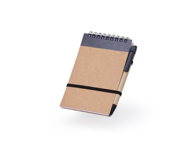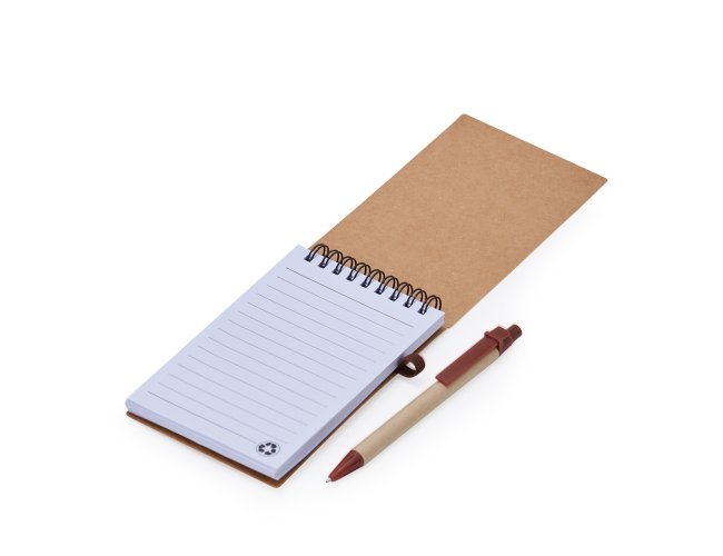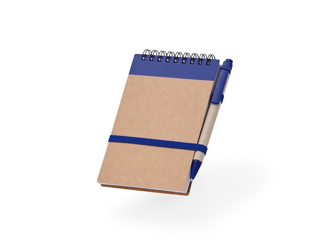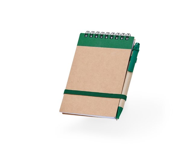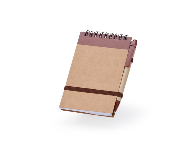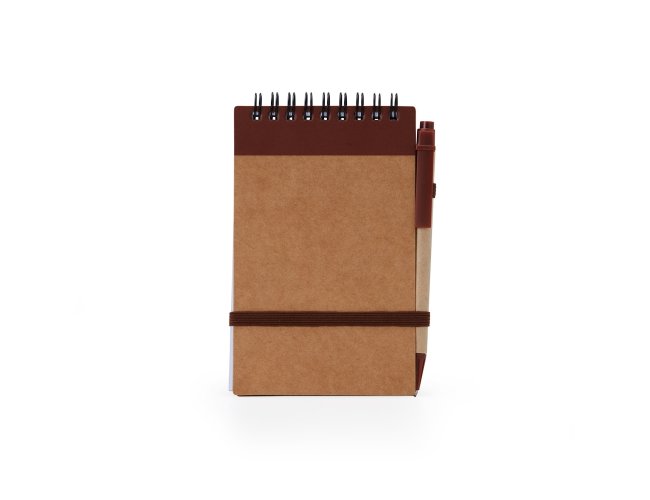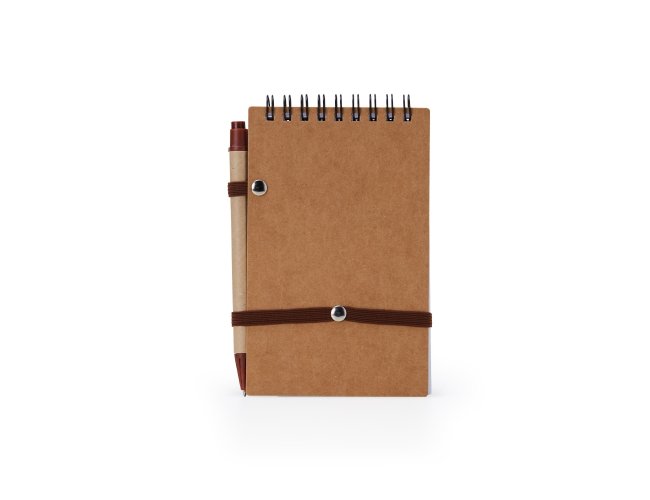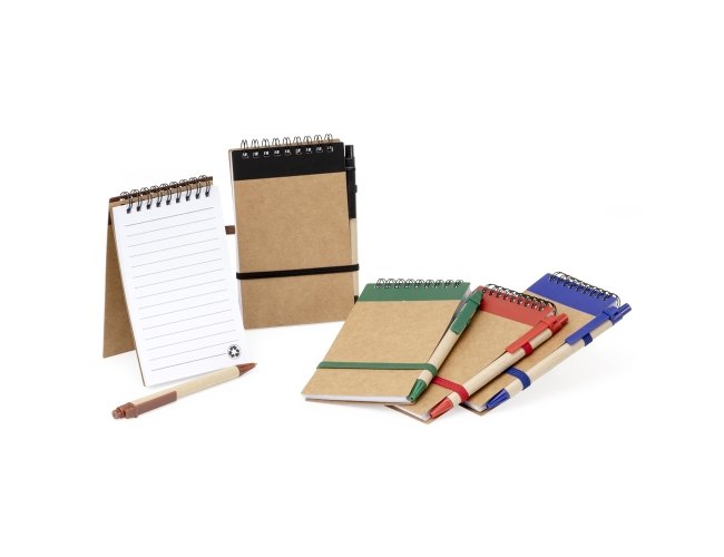 Bloco de anotações ecológico com caneta, feito em kraft com detalhe plástico. Contém aproximadamente 70 folhas brancas com pauta, porta caneta elástico, elástico para lacre e acompanha caneta de papelão com detalhes plásticos, carga esferográfica azul 1.0mm e acionamento por clique.