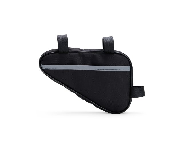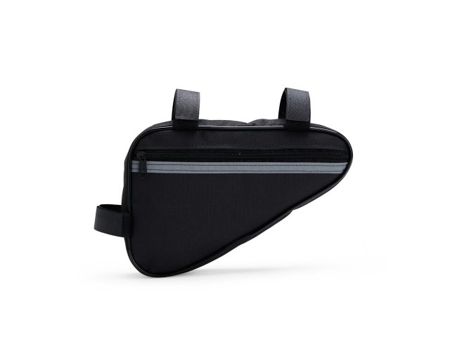 Bolsa de quadro de bicicleta confeccionada em Oxford impermeável. Possui um único compartimento, além de duas alças de nylon com fechamento em velcro e uma tira reflexiva costurada próxima à abertura da bolsa.