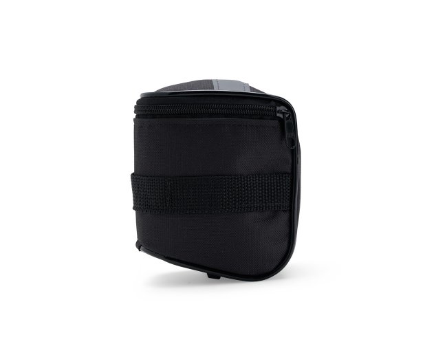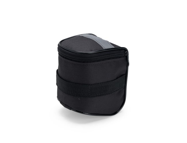 Bolsa para selim de bicicleta, de compartimento único e confeccionada em Oxford impermeável. Conta com uma tira externa reflexiva costurada para maior visibilidade no trânsito e alças de nylon com fechamento ajustável em velcro.