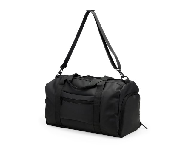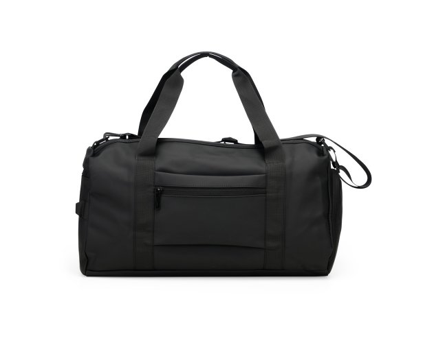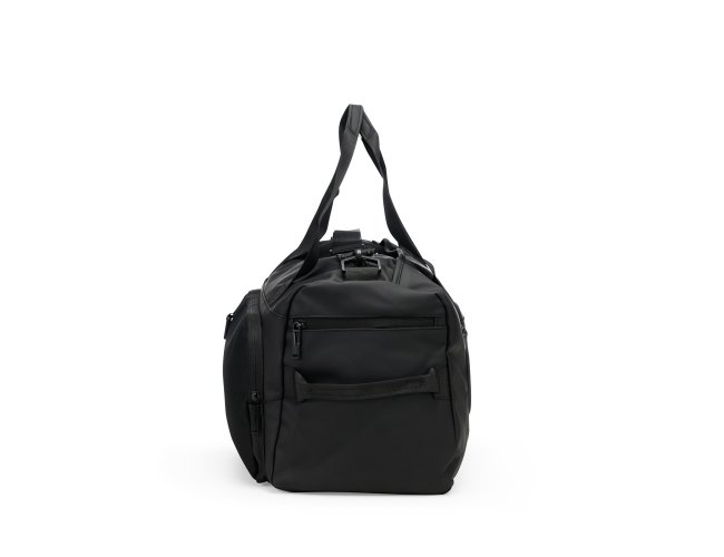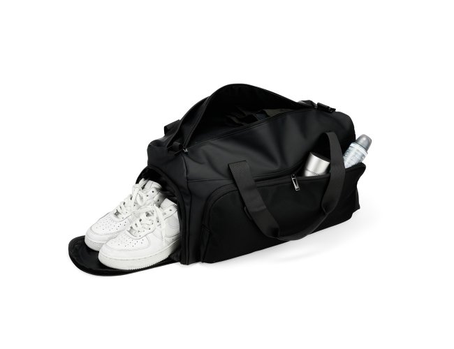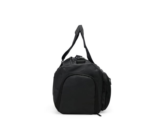 Bolsa confeccionada em couro sintético com capacidade de até 32 litros. Apresenta compartimento interno com bolso de zíper e outros dois bolsos abertos. Conta ainda com cinco compartimentos externos em diferentes tamanhos, incluindo um lateral dedicado para tênis, um bolso menor com encaixe para malas e outro para itens molhados. Possui duas alças de mão e alça transversal removível.