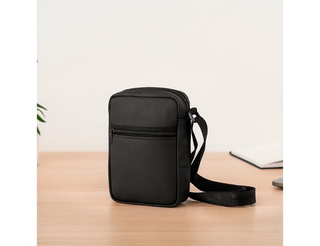 Bolsa de ombro confeccionada em couro sintético com fechamento em zíper e alça ajustável. Possui dois compartimentos: um com bolso aberto em tecido de malha e outro localizado na parte frontal.