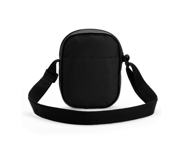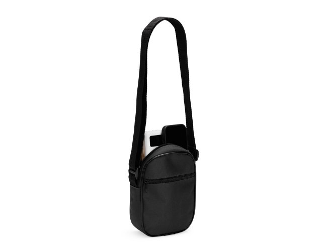 Bolsa de ombro confeccionada em poliéster resistente à água e alça de nylon ajustável. Possui compartimento interno com fechamento em zíper e dois bolsos externos: um aberto e outro com zíper.