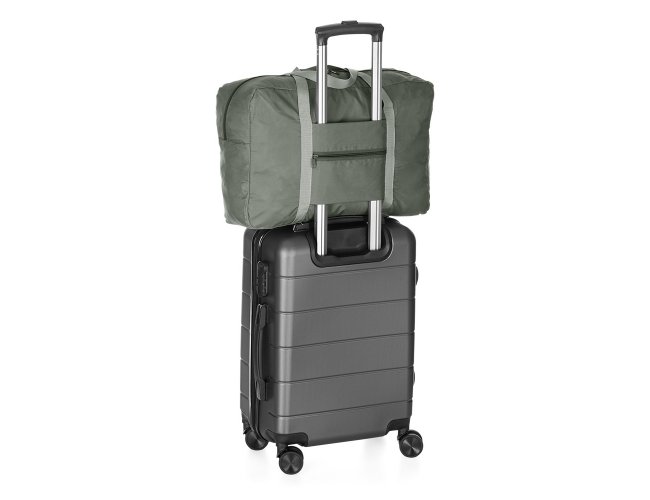 Contém bolso para encaixe em malas de viagem. Bolsa de viagem dobrável 32 litros em poliéster impermeável com dois compartimentos.