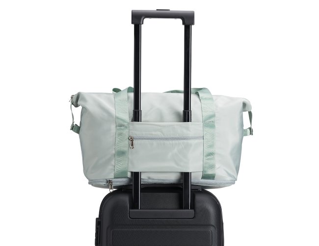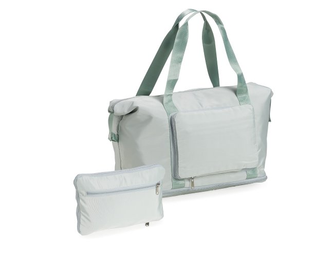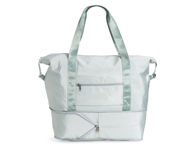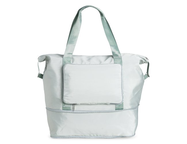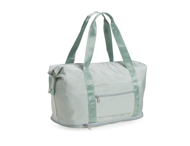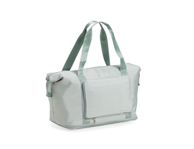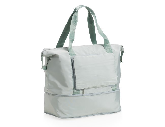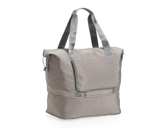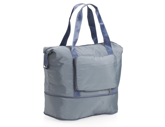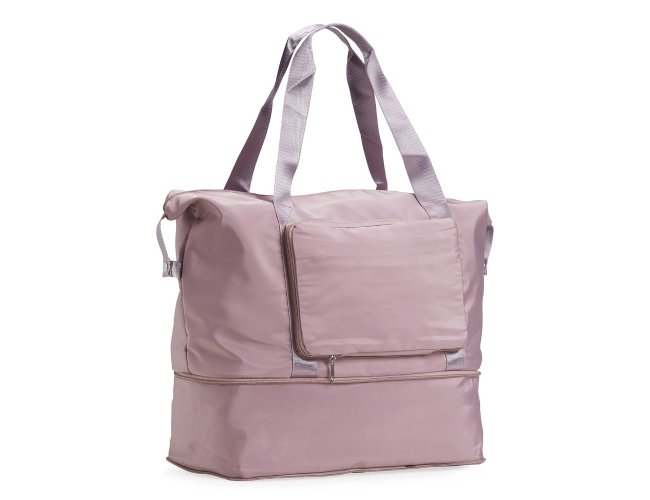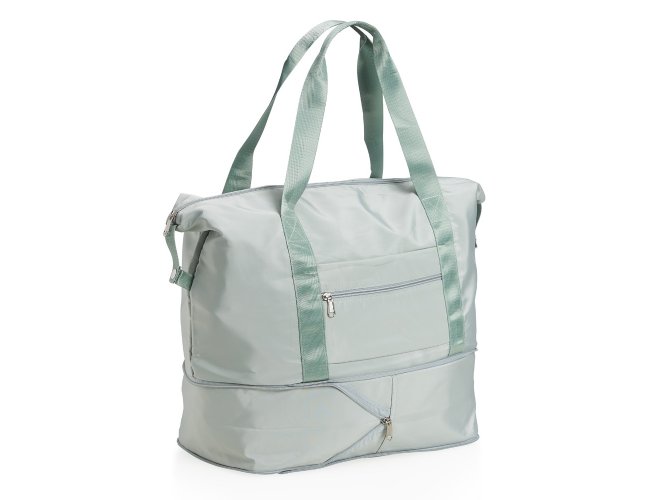 Sendo dois deles exclusivos para tênis e itens molhados. Bolsa dobrável e expansível de 40 litros em poliéster à prova dágua com dois compartimentos e bolsos internos.