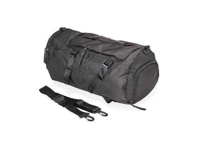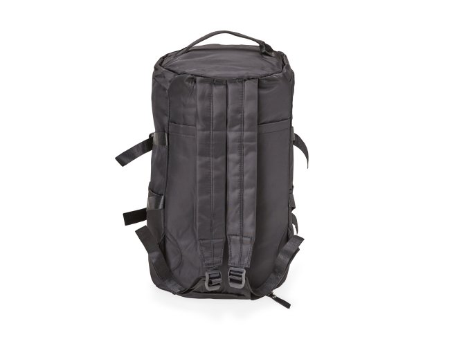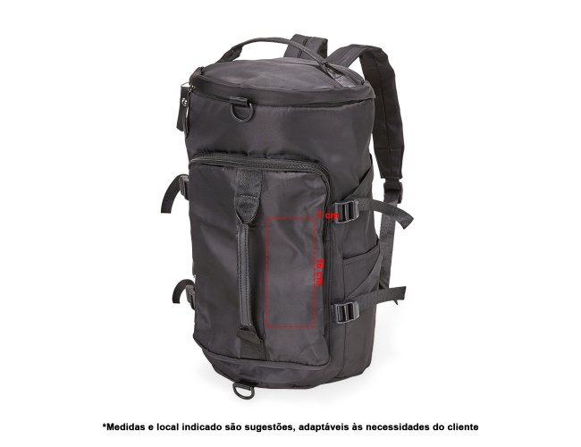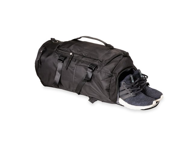 Bolsa esportiva de 30 litros em poliéster de impacto impermeável com três compartimentos, sendo um deles exclusivos para tênis. Compartimento principal com dois bolsos, sendo um deles com zíper exclusivo para itens molhados. Com bolsos laterais e duas alças de mãos, a bolsa contém alças de compensação, alça transversal removível e alças para as costas ocultas no compartimento inferior, podendo ser transportada como mochila.