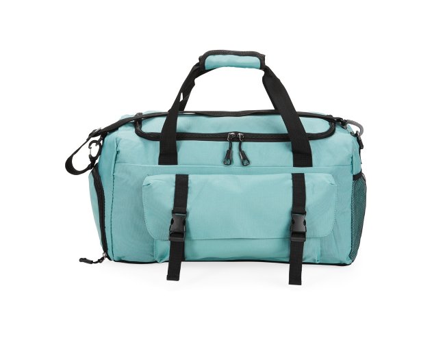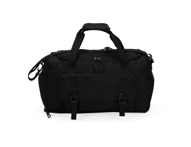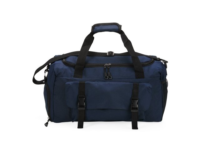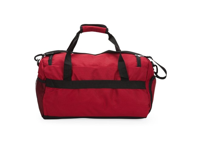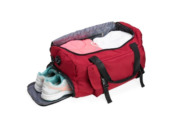 Bolsa esportiva de 39 litros em nylon resistente à água com três compartimentos, sendo um deles exclusivos para tênis. Compartimento principal com bolso de zíper exclusivo para itens molhados. Com bolso lateral telado e alças de mãos com suporte de juntura, a bolsa contém alça transversal removível e alça para engate em malas de viagem.