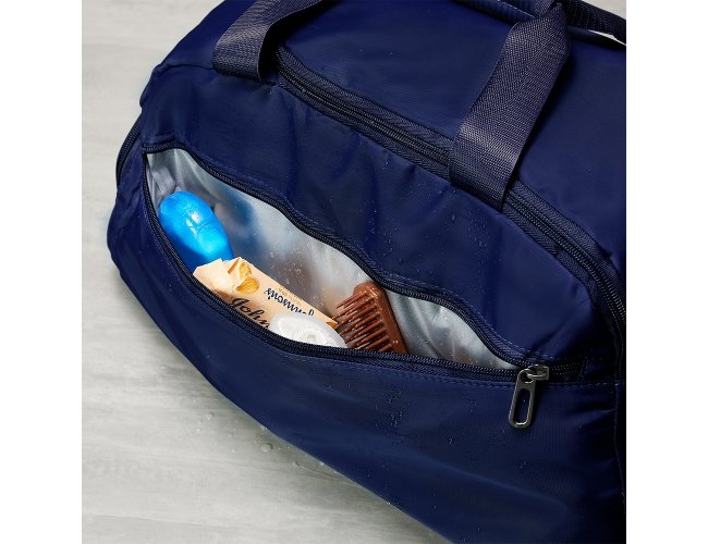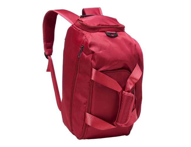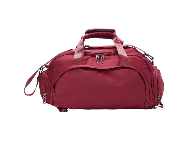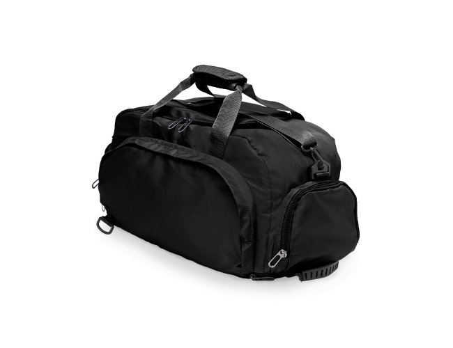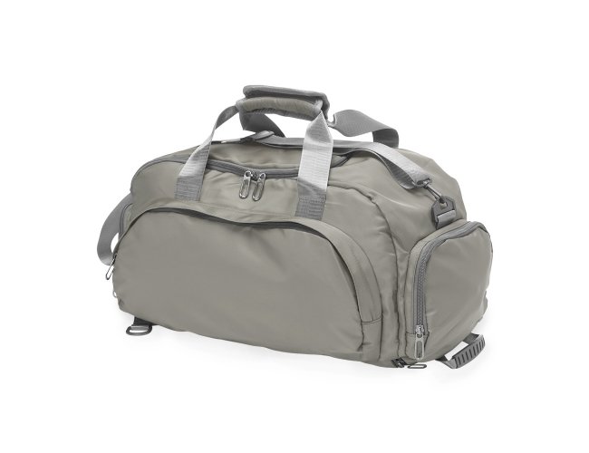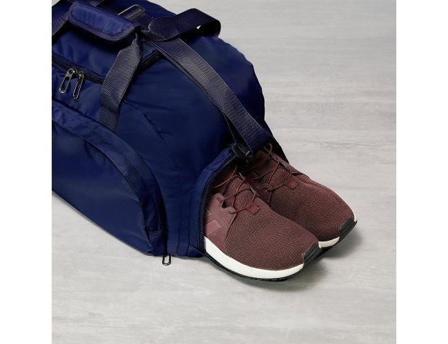 Bolsa esportiva com capacidade de até 28 litros em poliéster resistente à água com cinco compartimentos, incluindo espaço exclusivos para tênis, itens molhados e para o armazenamento da alça de costas, o que permite utilizá-la como mochila. Possui ainda alça transversal removível, alças de mãos com suporte de juntura.