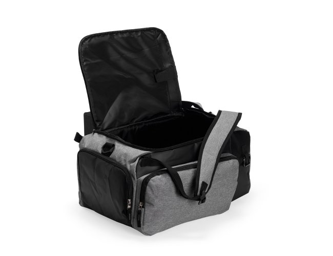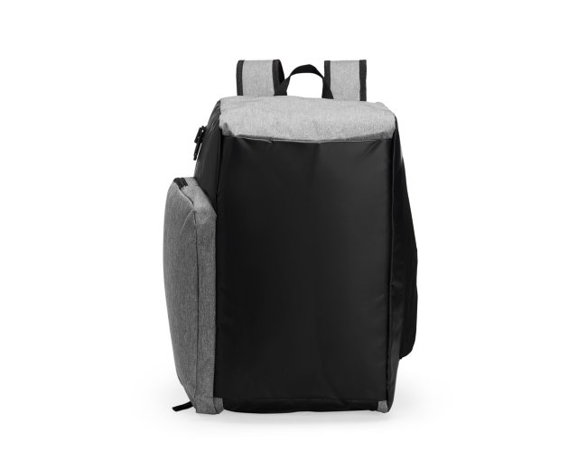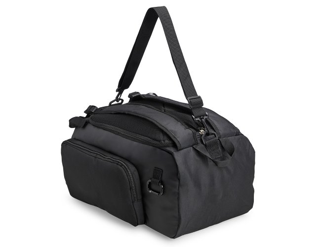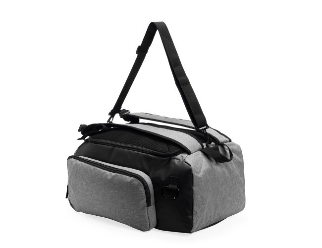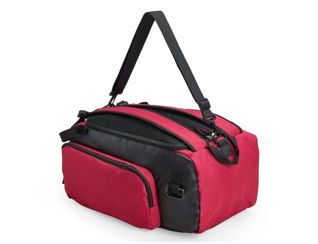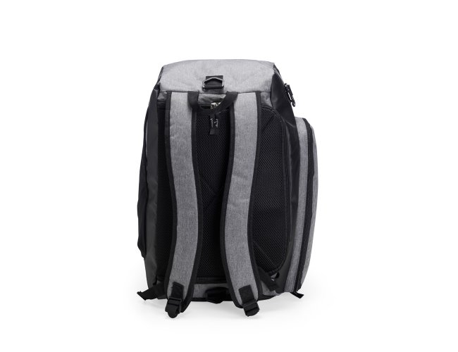 Bolsa esportiva resistente à água, feita em poliéster com detalhes emborrachados e capacidade para até 40 litros. Possui três compartimentos principais, um deles com bolso para notebook de até 13 polegadas, além de espaço dedicado para guardar tênis. Conta ainda com bolso lateral de malha para acesso rápido aos itens. A bolsa apresenta alça transversal regulável e removível, duas alças para as costas e área costada revestidas com espuma respirável, permitindo o uso como mochila.