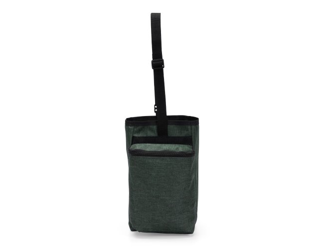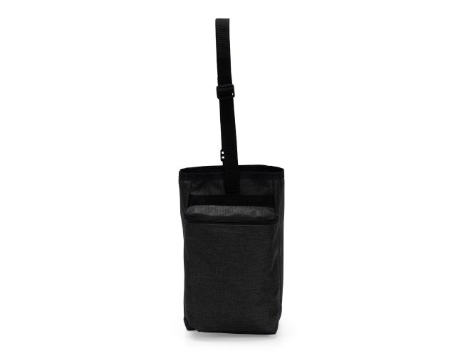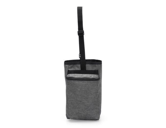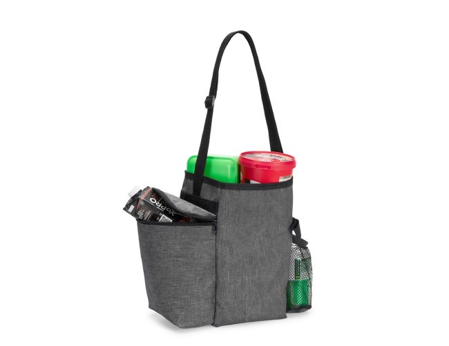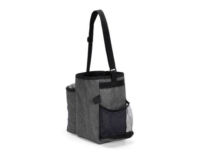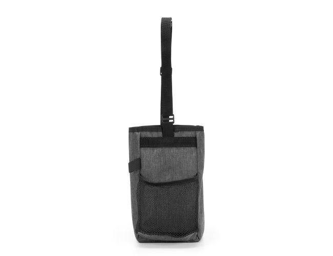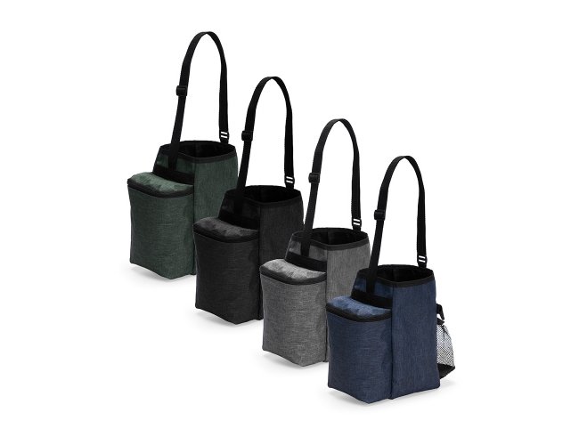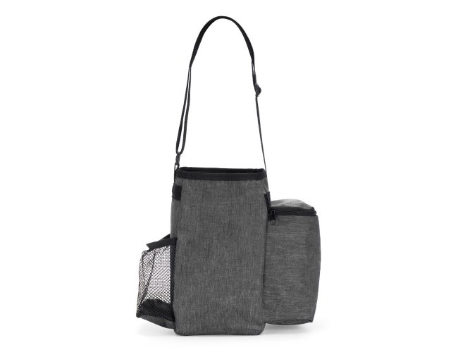 Bolsa confeccionada em poliéster mesclado com PVC, resistente à água e sem fechamento principal. Possui dois compartimentos externos: um bolso em tela de nylon e outro com fechamento em zíper. Dispõe ainda de alça transversal ajustável.
