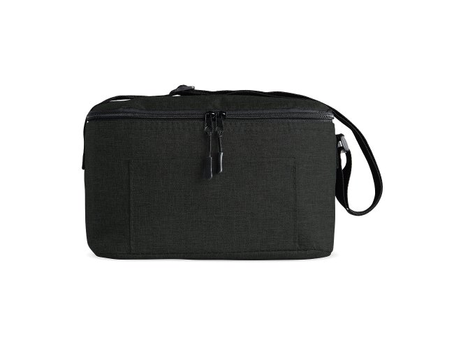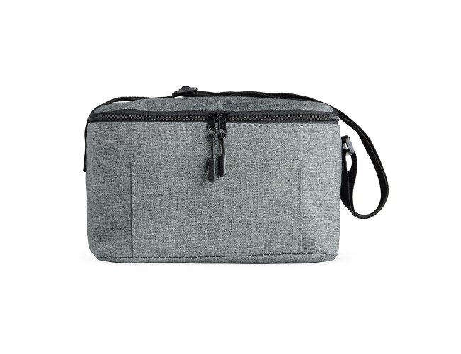 Bolsa térmica 10 litros de poliéster. Contém bolso frontal com zíper e alça transversal regulável em nylon (não removível).