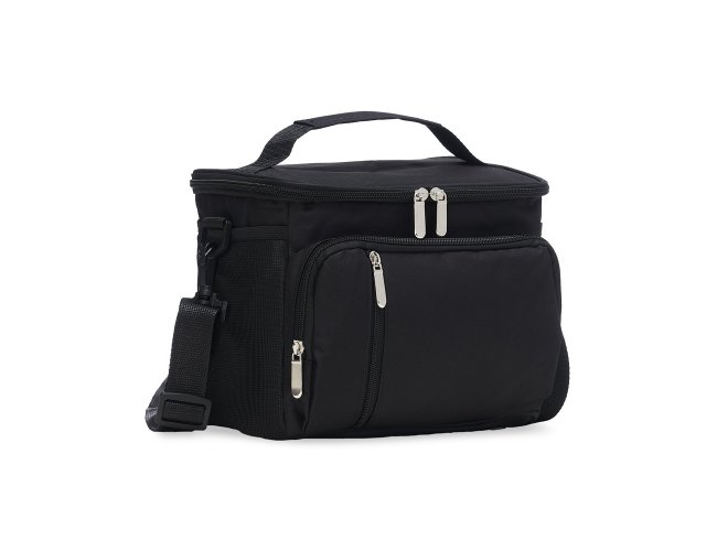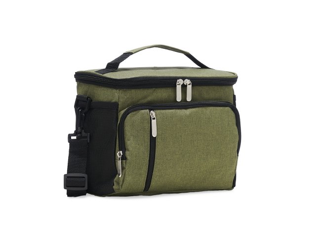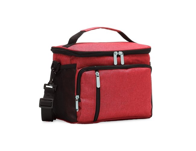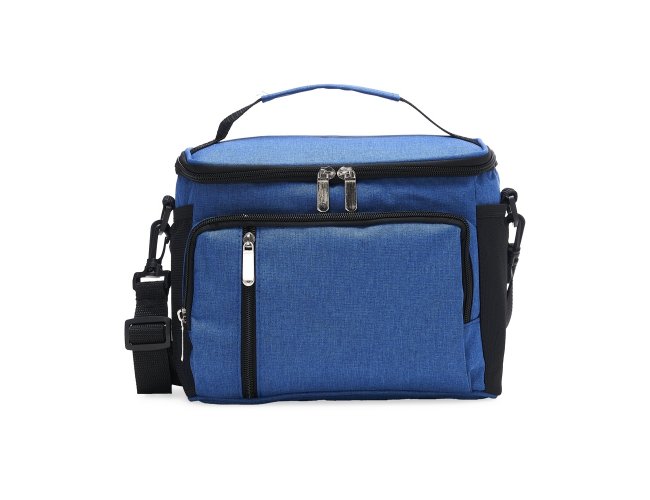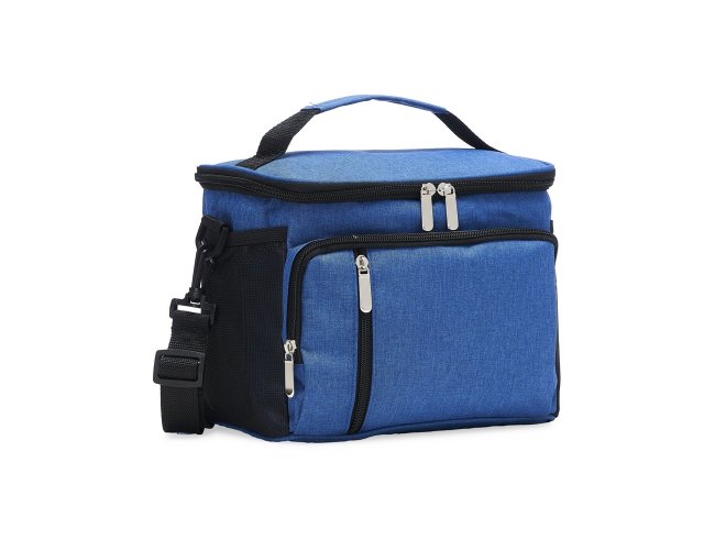 Bolsa térmica de poliéster com três compartimentos, capacidade de 11 litros. A bolsa possui revestimento térmico em PEVA atóxico com costura soldada (não vaza), alça de mão, bolsos laterais telados e acompanha alça transversal.