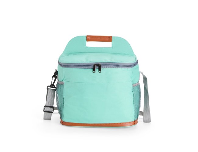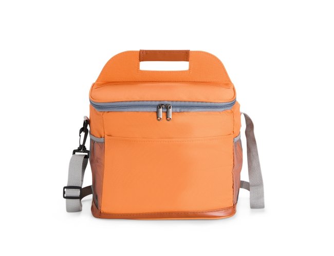 Bolsa térmica confeccionada em Oxford impermeável, com detalhes em couro sintético, fechamento em zíper e capacidade de até 11 litros. Possui revestimento interno em PEVA, que proporciona a conservação de temperatura de alimentos e bebidas por mais tempo. Conta com bolso frontal aberto, dois laterais em tela de nylon com elástico, alça de mão, alça transversal ajustável e abridor de garrafas em inox fixado em uma das laterais.