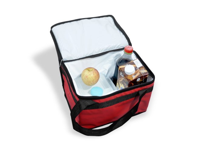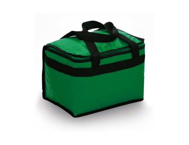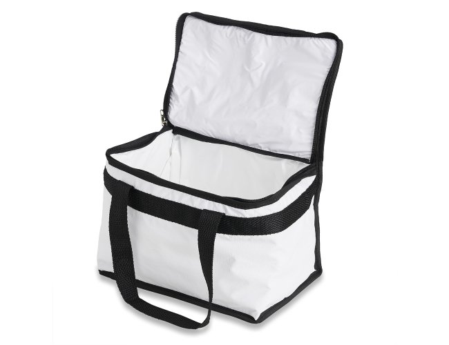 Bolsa térmica 13 litros confeccionada em bagum sintético, contém revestimento interno em polietileno atóxico soldado (não vaza) e alça para mãos em polipropileno.