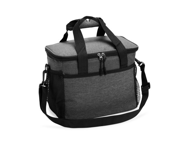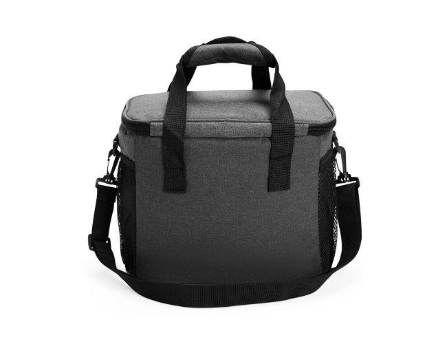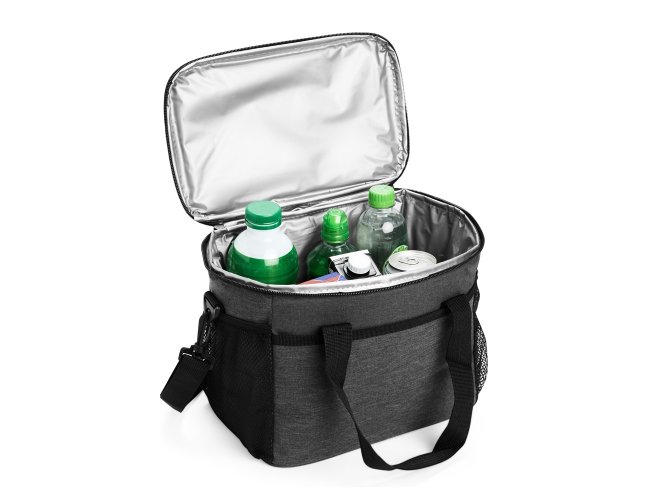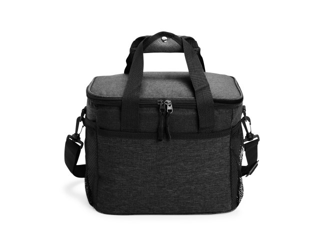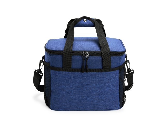 Bolsa térmica de nylon 14 litros com bolso frontal e bolsos laterais em malha. Compartimento principal com revestimento térmico soldado antivazamento e alças de mãos com suporte de juntura. Acompanha alça transversal.