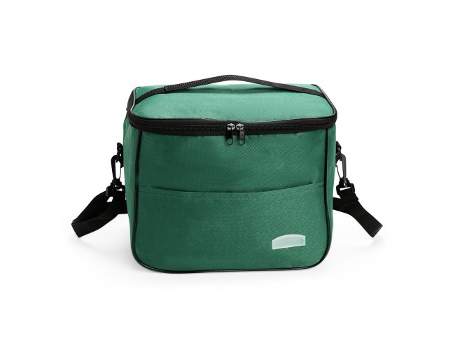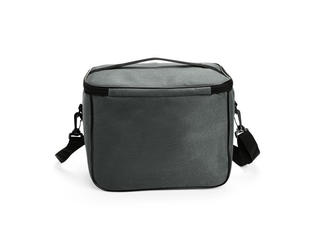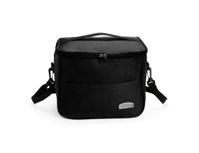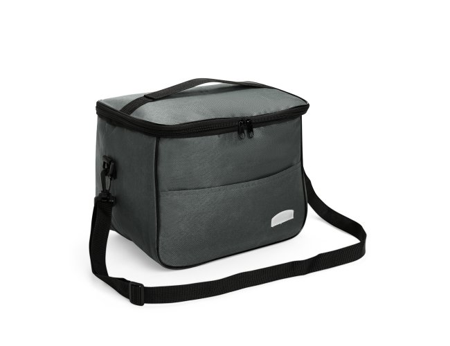 Bolsa térmica feita em Oxford resistente à água, com fechamento em zíper e capacidade de até 16 litros. Possui revestimento térmico em folha de alumínio, bolso frontal externo e duas alças: uma fixa localizada na tampa e outra transversal removível.