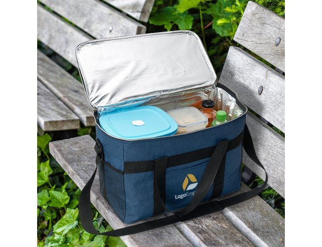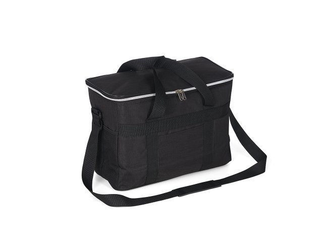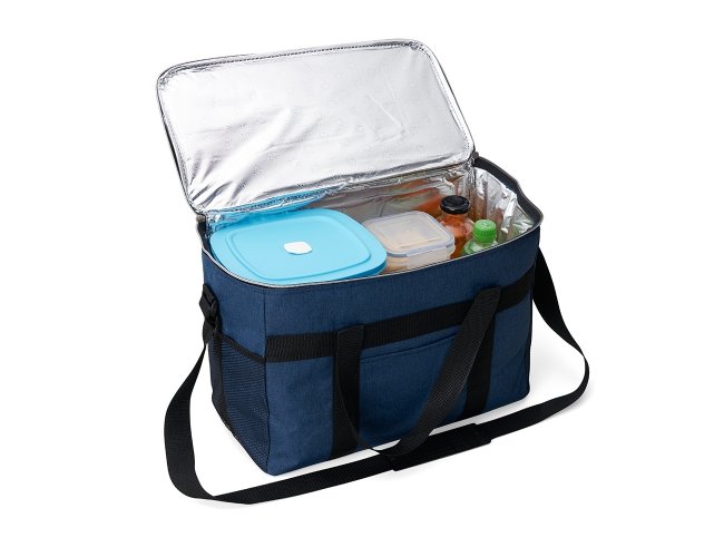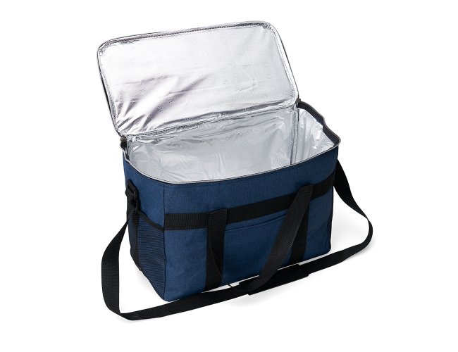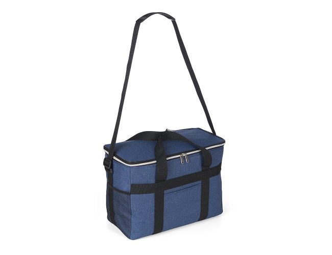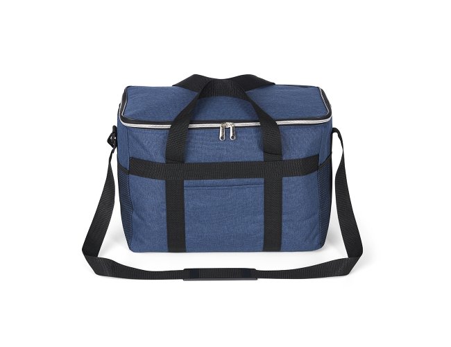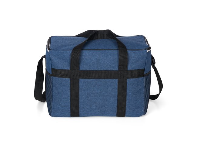 Bolsa térmica de poliéster oxford 300D de 31 litros com bolso frontal e bolsos laterais em malha.