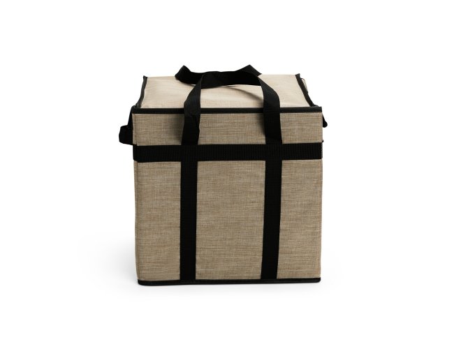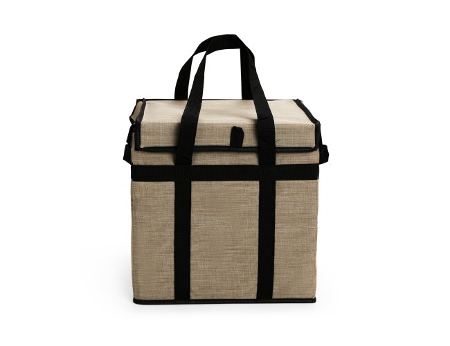 Bolsa térmica confeccionada em Oxford impermeável, fechamento em velcro e capacidade máxima de 35 litros. Conta com armação interna em placa de PVC e junção inferior em velcro, que facilita o transporte quando a bolsa não estiver em uso. Possui revestimento térmico interno em folha de alumínio e um par de alças de nylon para transporte.