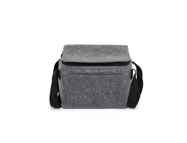Bolsa térmica feita em feltro com capacidade para 6 litros, possui revestimento térmico, bolso frontal e alças para as mãos.