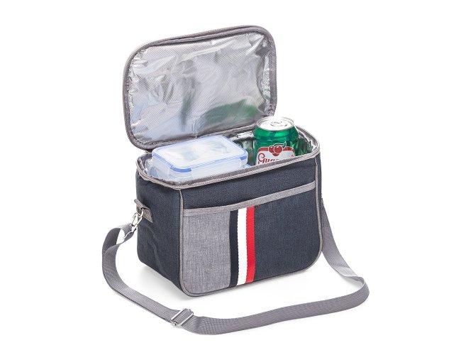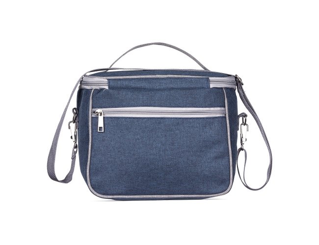 Bolsa térmica de nylon 7 litros com dois compartimentos e bolso frontal. Compartimento principal com revestimento térmico. Acompanha alça transversal.