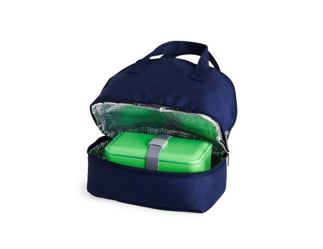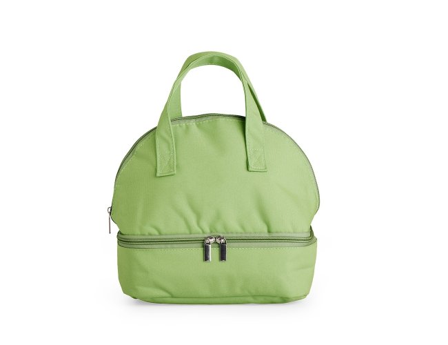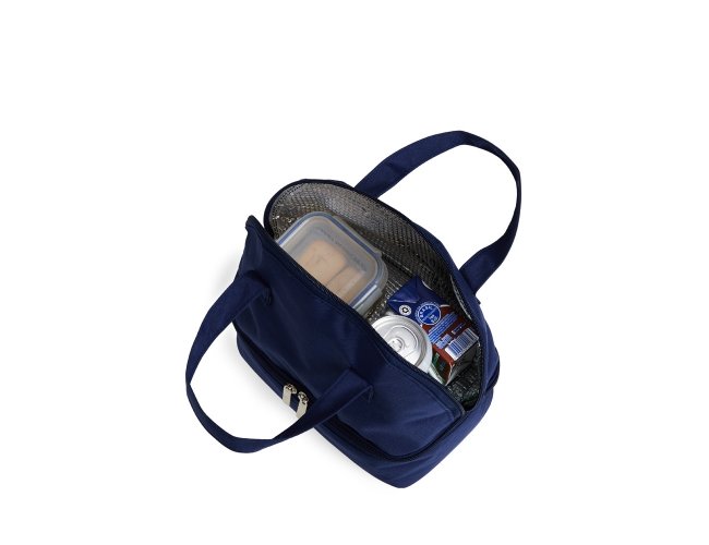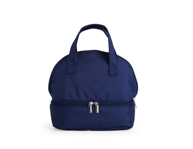 Bolsa térmica dupla em oxford com dois compartimentos térmicos isolados, capacidade de 9 litros. Contém alças de mãos.