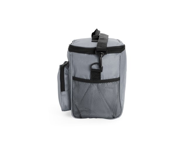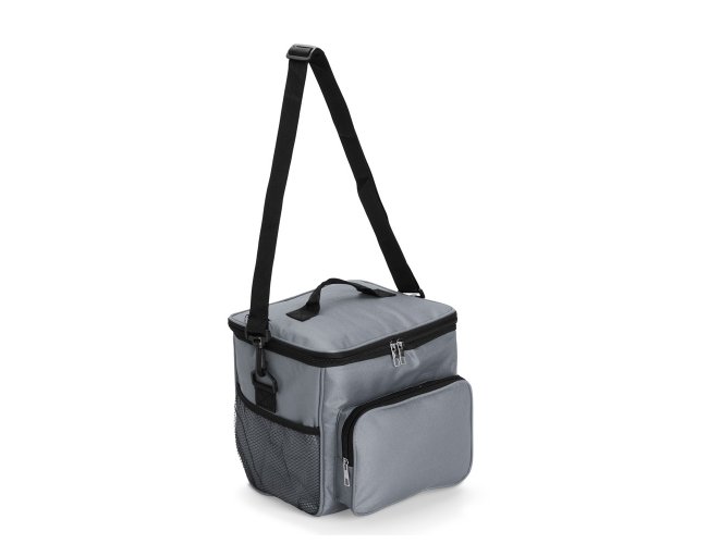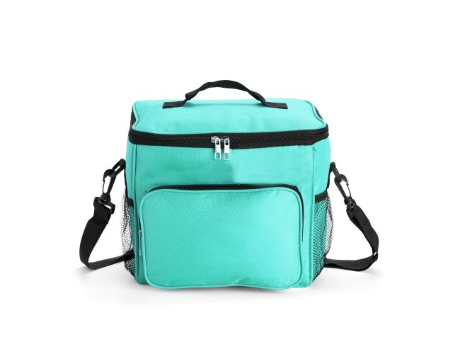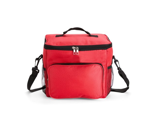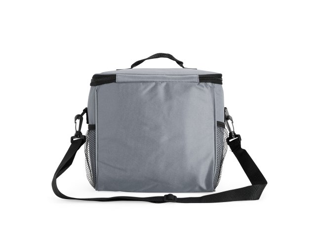 Bolsa térmica em Oxford resistente à água e com capacidade de até 11 litros. Seu revestimento interno em alumínio permite a conservação de temperatura de alimentos e bebidas por mais tempo. Possui também um bolso frontal e mais um par de bolsos laterais em tela de nylon, além de uma alça fixa na tampa e outra transversal.