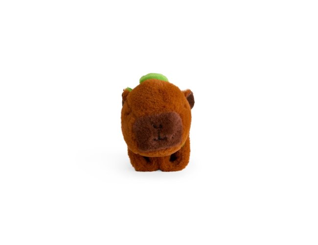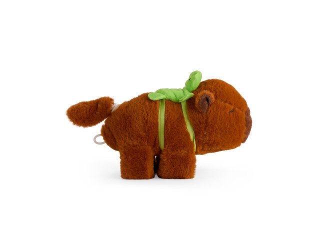 Bracelete em pelúcia macia com o formato de uma capivara e ajuste ao estilo bate-enrola. Acompanha mochila removível no formato de tartaruga para decoração.