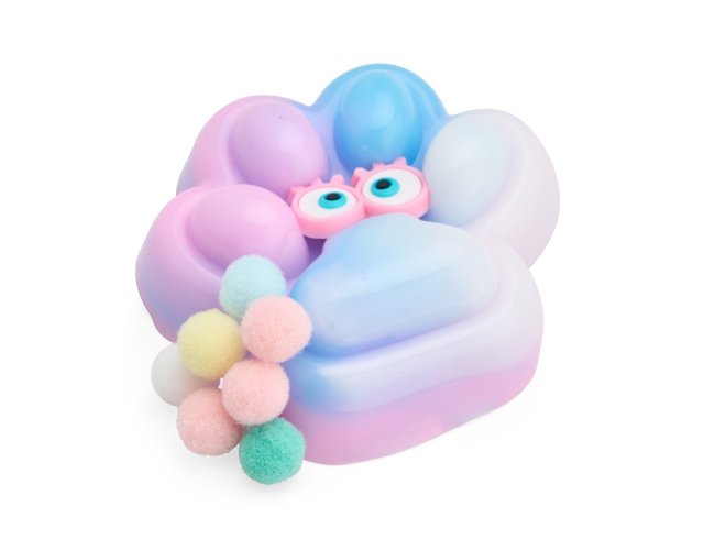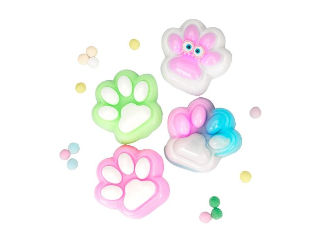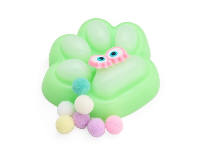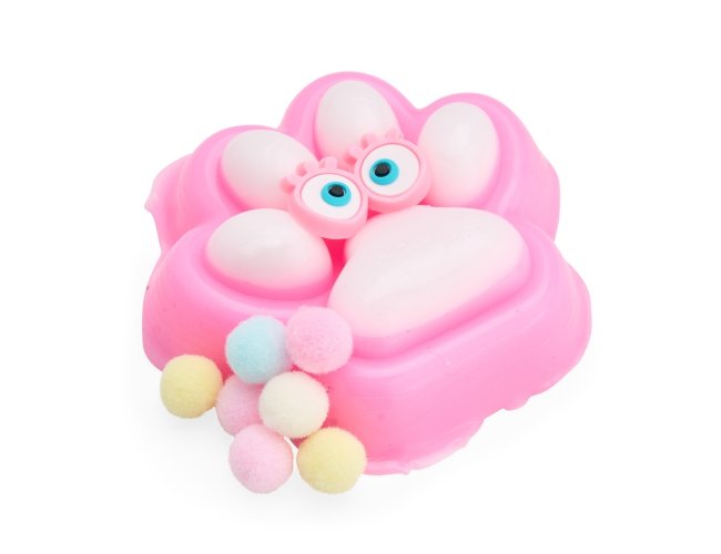 Brinquedo apertável antiestresse em formato de pata estilizada. Produzido em borracha termoplástica com superfície lisa e macia, adere facilmente a superfícies planas e acompanha bolinhas de pelúcia para decoração.