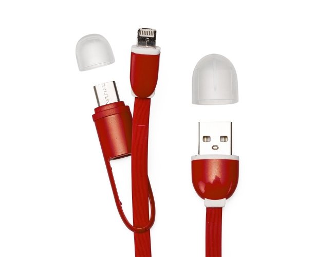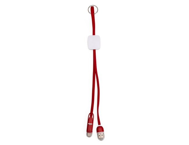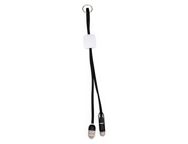Cabo de dados USB com as entradas Lightning/iPhone, V8/Android e Tipo-C/Android. Contém base plástica quadrangular para personalização, acompanha tampas de proteção e argola para chaveiro.